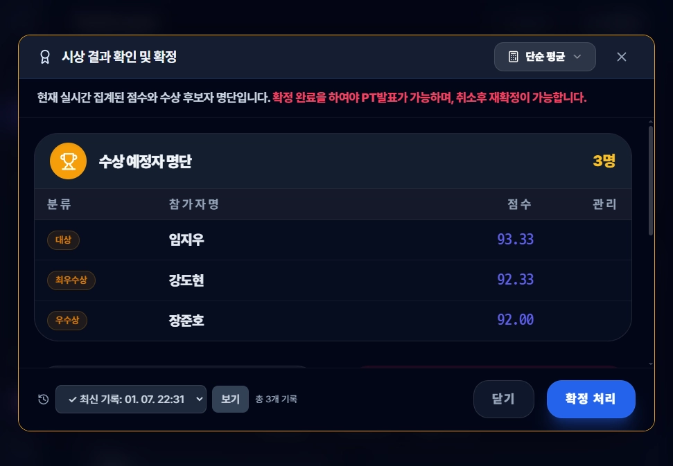 "이전에는 수기 집계라 오류가 있을까 봐 늘 불안했고 참가자들도 의구심을 가졌는데, 시스템으로 투명하게 점수가 공개되니 공정성 시비가 전혀 없었습니다. 심사 리포트까지 제공되어 더욱 전문적으로 보였습니다."